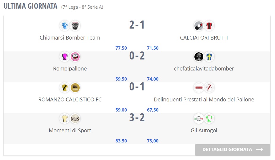 Nelle altre partite, Chiamarsi Bomber grazie al tridente Orsolini-Mertens-Lautaro vince 2-1 contro Calciatori Brutti, e grazie a questi 3 punti abbandonano l'ultimo posto in classifica, salgono a quota 4 punti, e lasciano l'ultima piazza e il cucchiaio di legno a Romanzo Calcistico, che nonostante il +4 di Berardi perdono ancora (0-1) contro Delinquenti Prestati al Mondo del Pallone, forti del solo +3 di Correa. Per loro, 4° posto ex aequo con Momenti Di Sport.