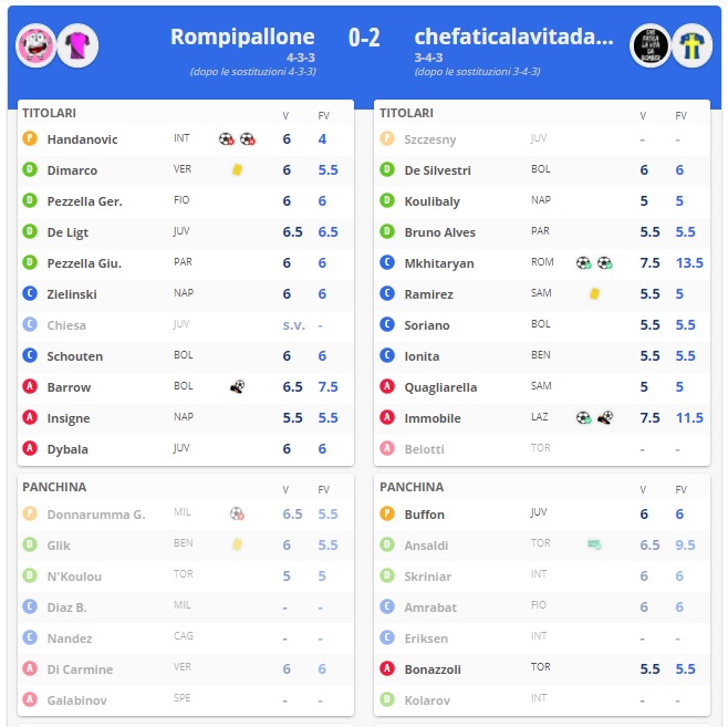Ma andiamo a vedere le due partite più significative della settima e ultima giornata nel dettaglio: Rompipallone.it puntava tutto sul tridente Barrow-Insigne-Dybala, che però non ha portato bonus pesanti. Anzi, da Handanovic in porta è arrivato un malus da -2, che certo non ha contribuito al risultato finale, insieme al fatto che la squadra s'è ritrovata a giocare in 10 per via dei SV di Chiesa, Diaz e Nandez. Non la migliore prestazione possibile, per una giornata che era decisiva! Di contro, Che Fatica La Vita Da Bomber ha offerta una buona prestazione, con i bonus dei soliti Mkhytarian e Immobile che hanno consentito di portare il totale di giornata a 74, e quindi a vincere per 2-0. Un risultato che piazza CFLVDB al 3° posto finale: un ottimo risultato, dopo un'asta discussa, che potete rivedere a questo link.
